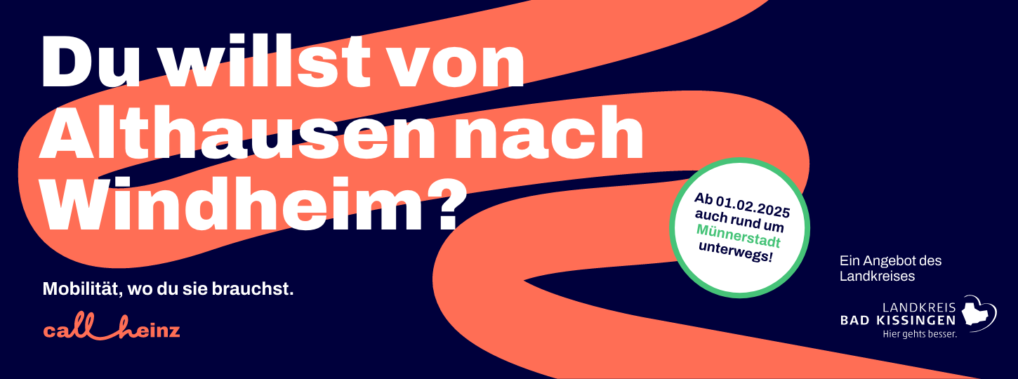 31. Januar 2025: Ab dem 1. Februar 2025 steht der innovative Mobilitätsservice Callheinz auch den Bürgerinnen und Bürgern von Münnerstadt zur Verfügung. Callheinz bietet eine ideale Ergänzung zu den bestehenden Verkehrsanbindungen und ermöglicht es, Fahrten flexibel über eine App oder telefonisch zu buchen.