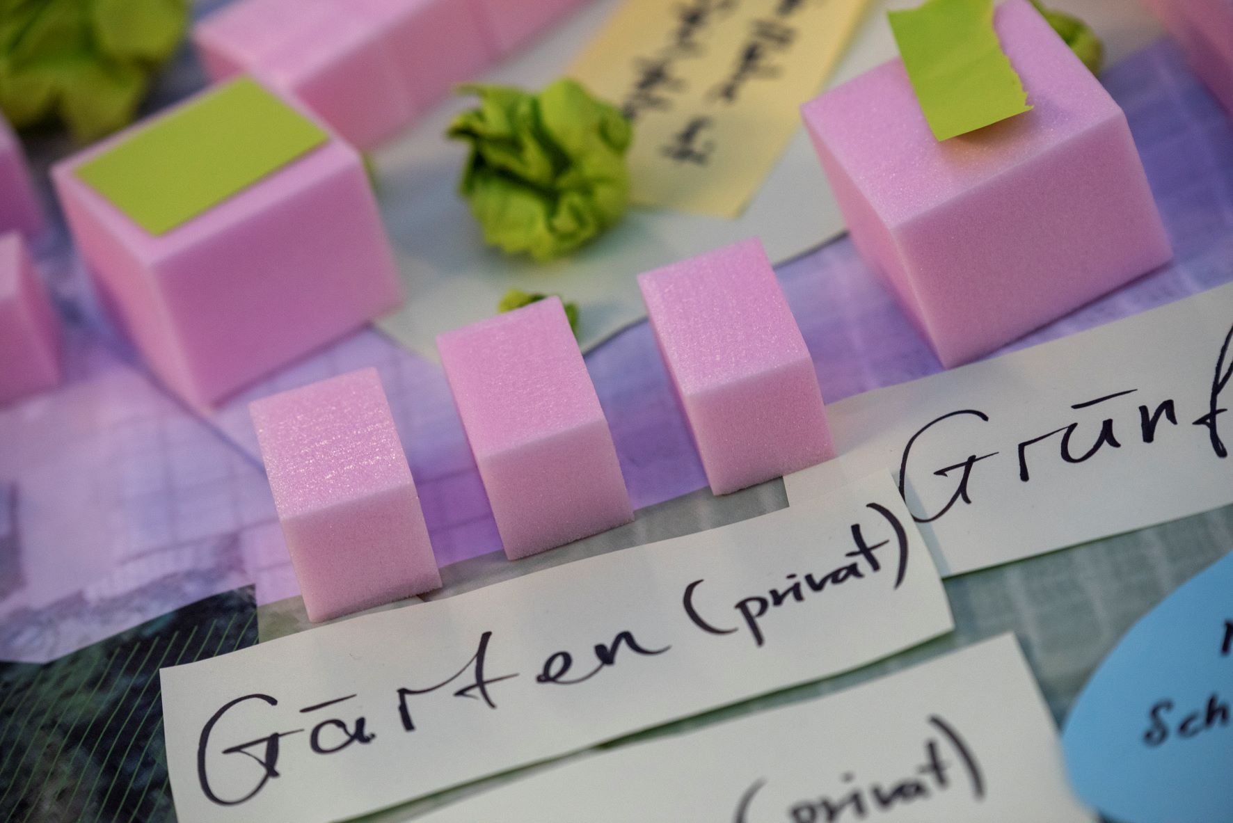 Anschließend wurden die Teilnehmerinnen und Teilnehmer städtebaulich kreativ und setzten ihre Vorstellungen anhand eines Modells des Gärtnereiareals mit verschiedenen Baumodulen, Straßen und Grünfächen selbst in die Tat um.